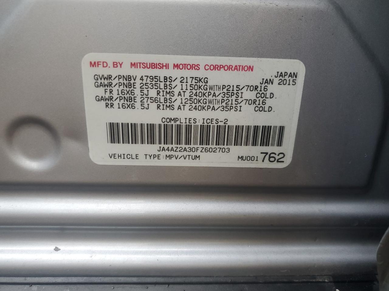 2015 MITSUBISHI OUTLANDER - JA4AZ2A30FZ602703