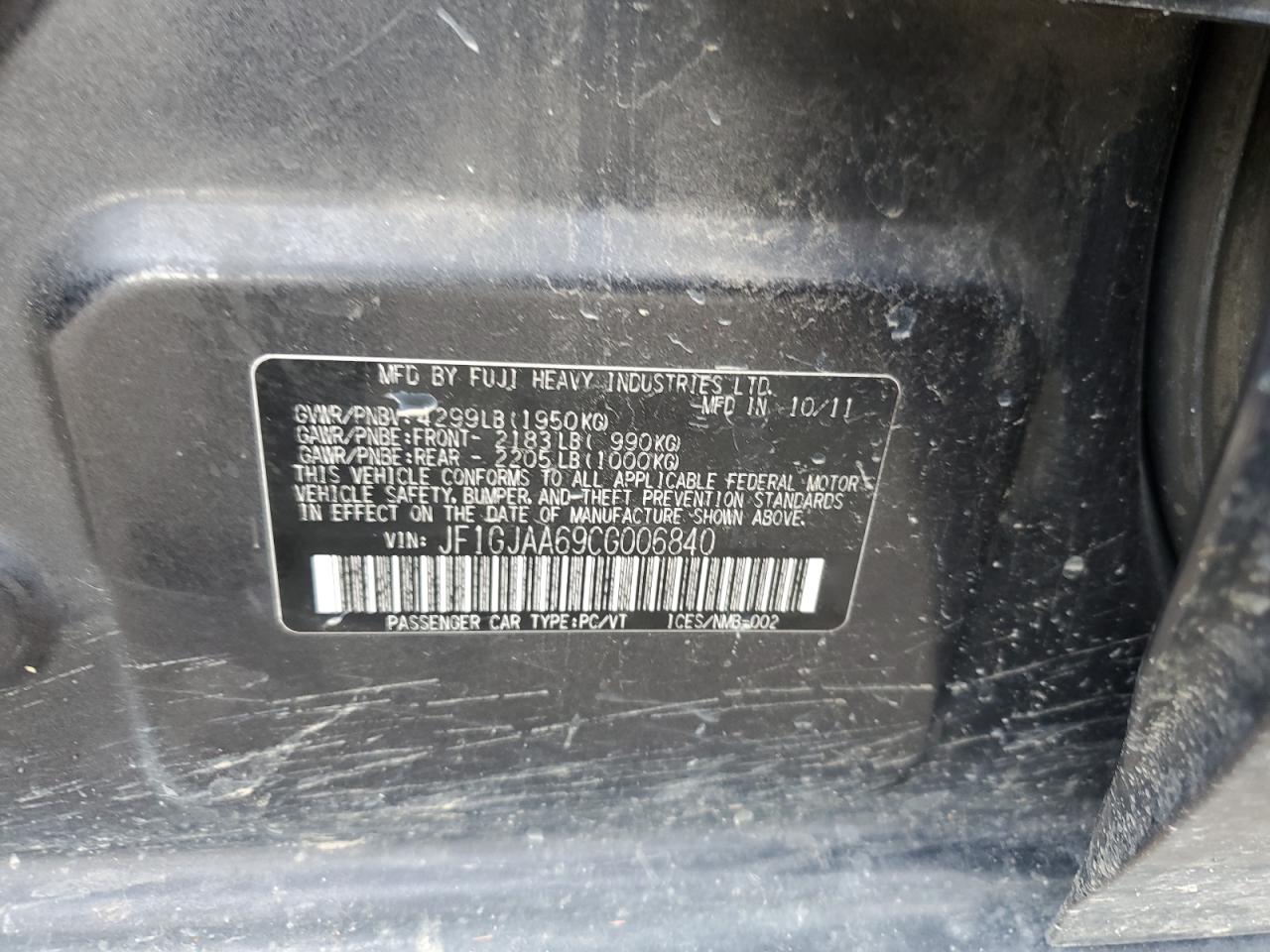 2012 SUBARU IMPREZA - JF1GJAA69CG006840