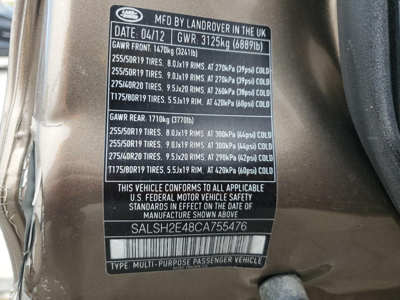 2012 LAND ROVER RANGE ROVE - SALSH2E48CA755476