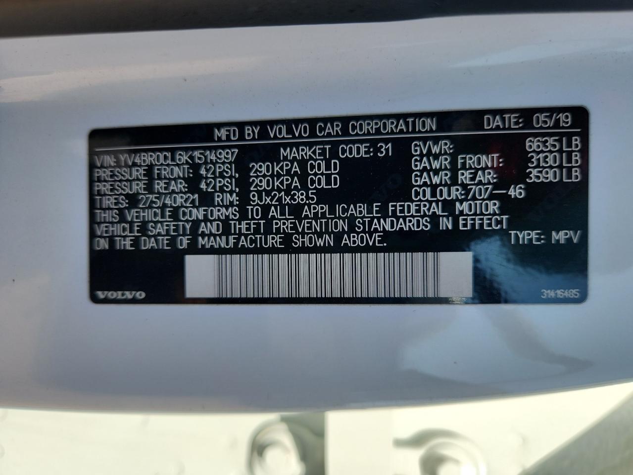 2019 VOLVO XC90 T8 IN - YV4BR0CL6K1514997