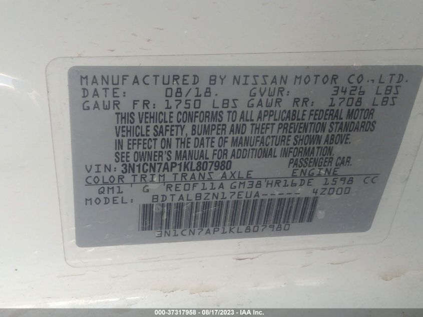 Этот 2019 NISSAN VERSA SEDAN SV является частью наших АВТОМОБИЛЬНЫХ транспортных средств. Его VIN-код - 3N1CN7AP1KL807980. Присоединяйтесь к автоматическому аукциона, чтобы сделать ставку на этот 2019 NISSAN VERSA SEDAN SV. Обратите внимание, на транспортном средстве могут быть такие повреждения: UNKNOWN, которые можно просмотреть подробнее, изучив фотографии, размещенные на этой странице.