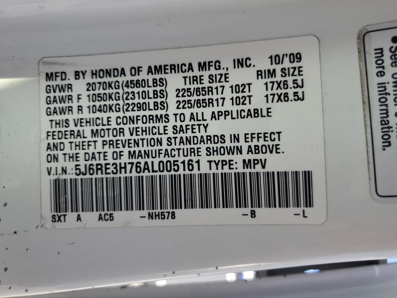 2010 HONDA CR-V EXL - 5J6RE3H76AL005161